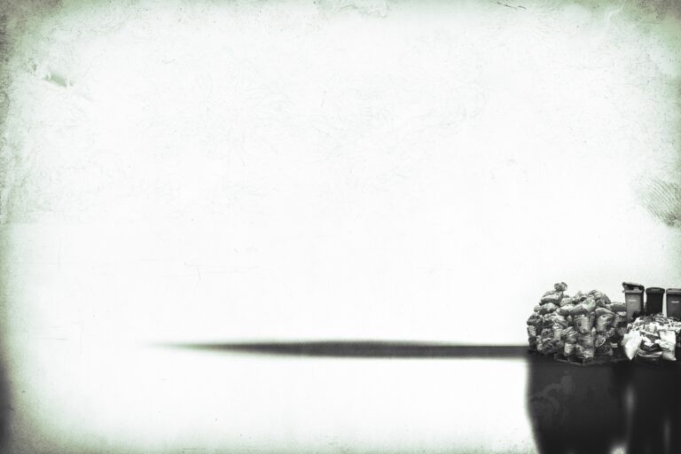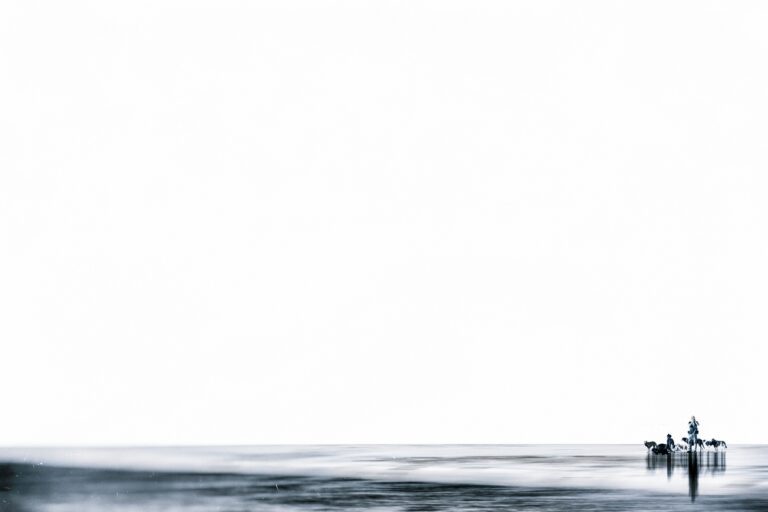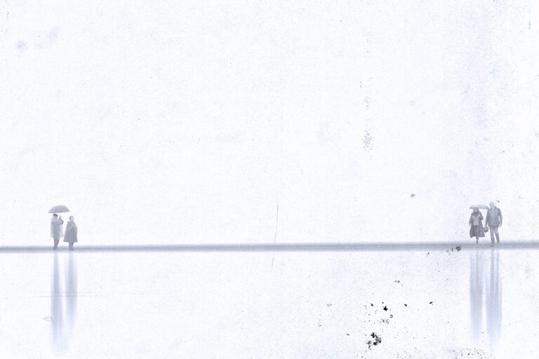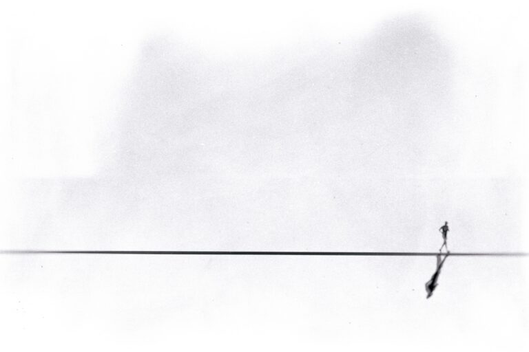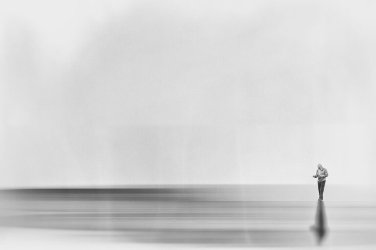 In Minimal Commodities, less becomes more. The images embrace simplicity, often dominated by wide swaths of negative space that heighten the impact of the few elements within them. Figures appear small and isolated — walking between high-rising buildings, waiting in the rain, or caught in the approach of a train. Sometimes the focus shifts to the quiet aftermath: the litter and remnants of human presence. Most works are presented in monochrome or with muted colors, enhancing the sense of restraint and stillness, though in certain scenes, touches of color break through, underscoring moments of significance amid the emptiness. The result is a minimalist visual language that leaves room for the viewer’s own interpretations.